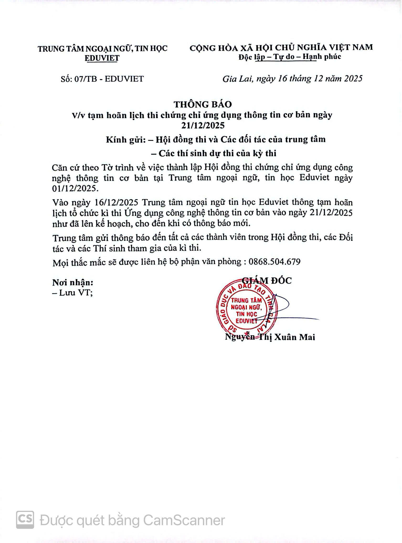 Vào ngày 16/12/2025 Trung tâm ngoại ngữ tin học Eduviet thông tạm hoãn lịch tổ chức kì thi Ứng dụng công nghệ thông tin cơ bản vào ngày 21/12/2025 như đã lên kế hoạch, cho đến khi có thông báo mới.